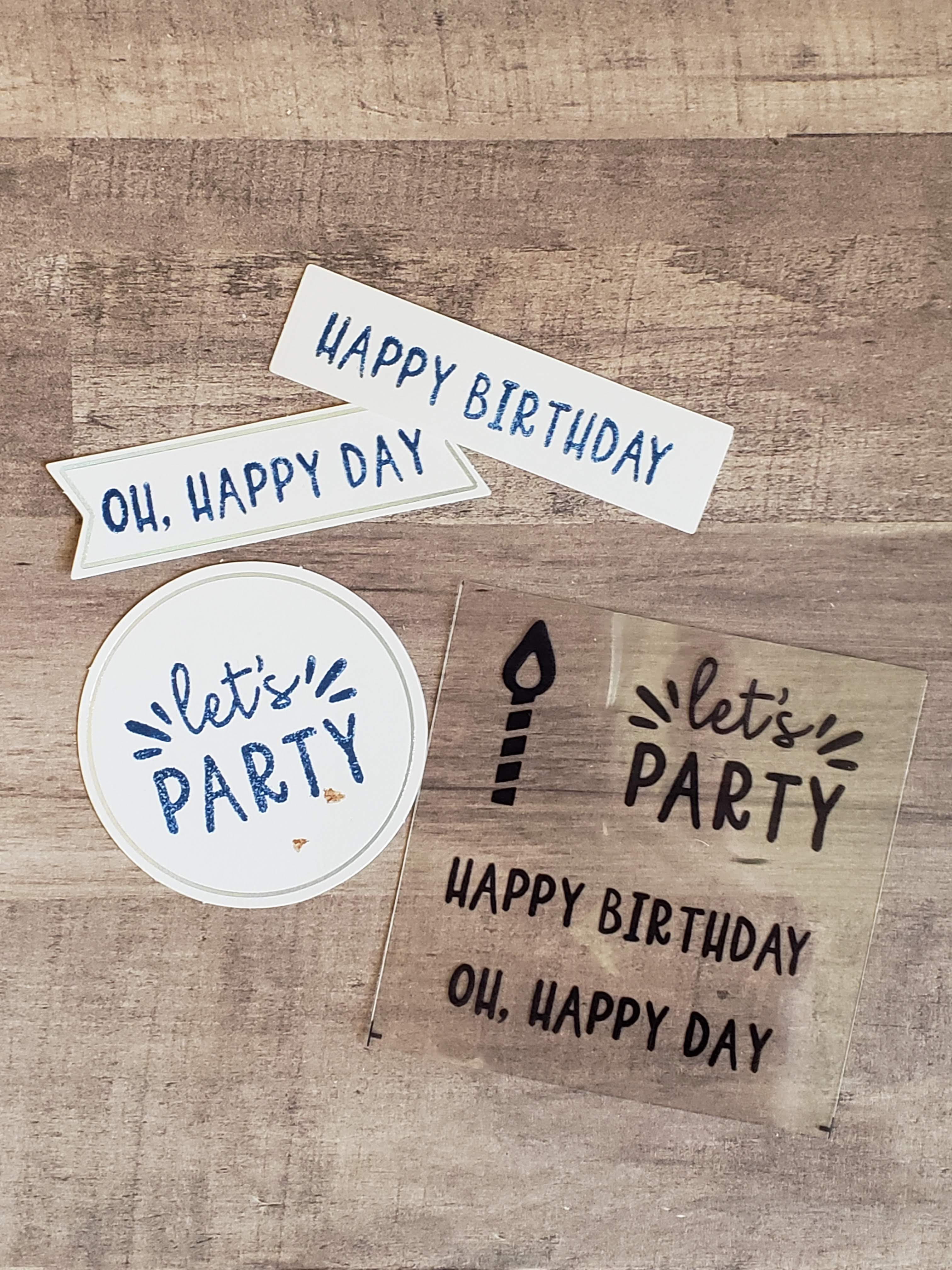 Let’s take the Let’s Party card first. This was very simple and I just added a couple of Rhinestones that I colored with a blue sharpie to give it a little more bling. Next is the card with the bow and I added a decorative dot to the bow from the 2022-2024 In Color Matte Decorative Dots. Finally on the birthday cake, I simply took my yellow marker and colored in the candle flames.