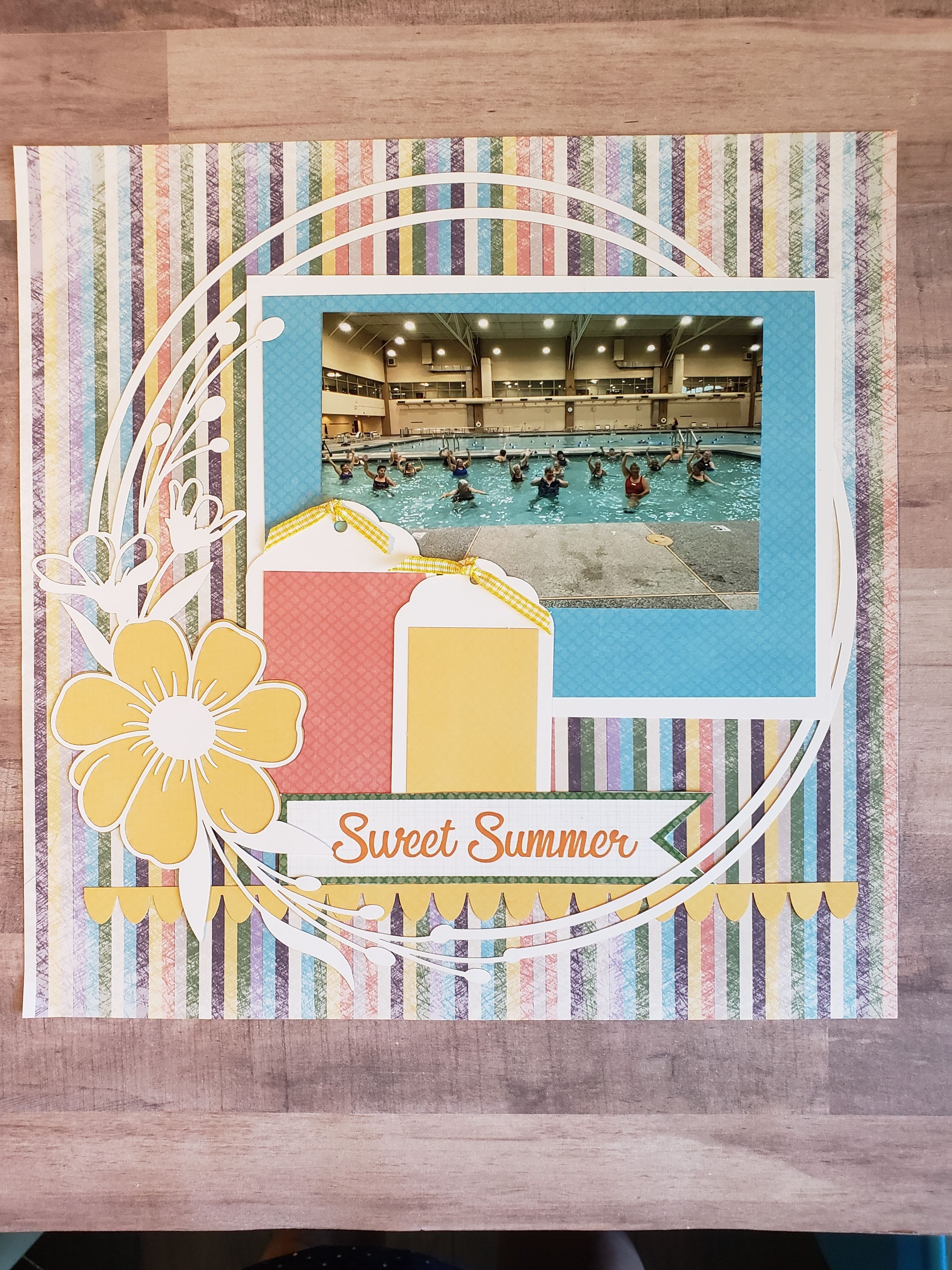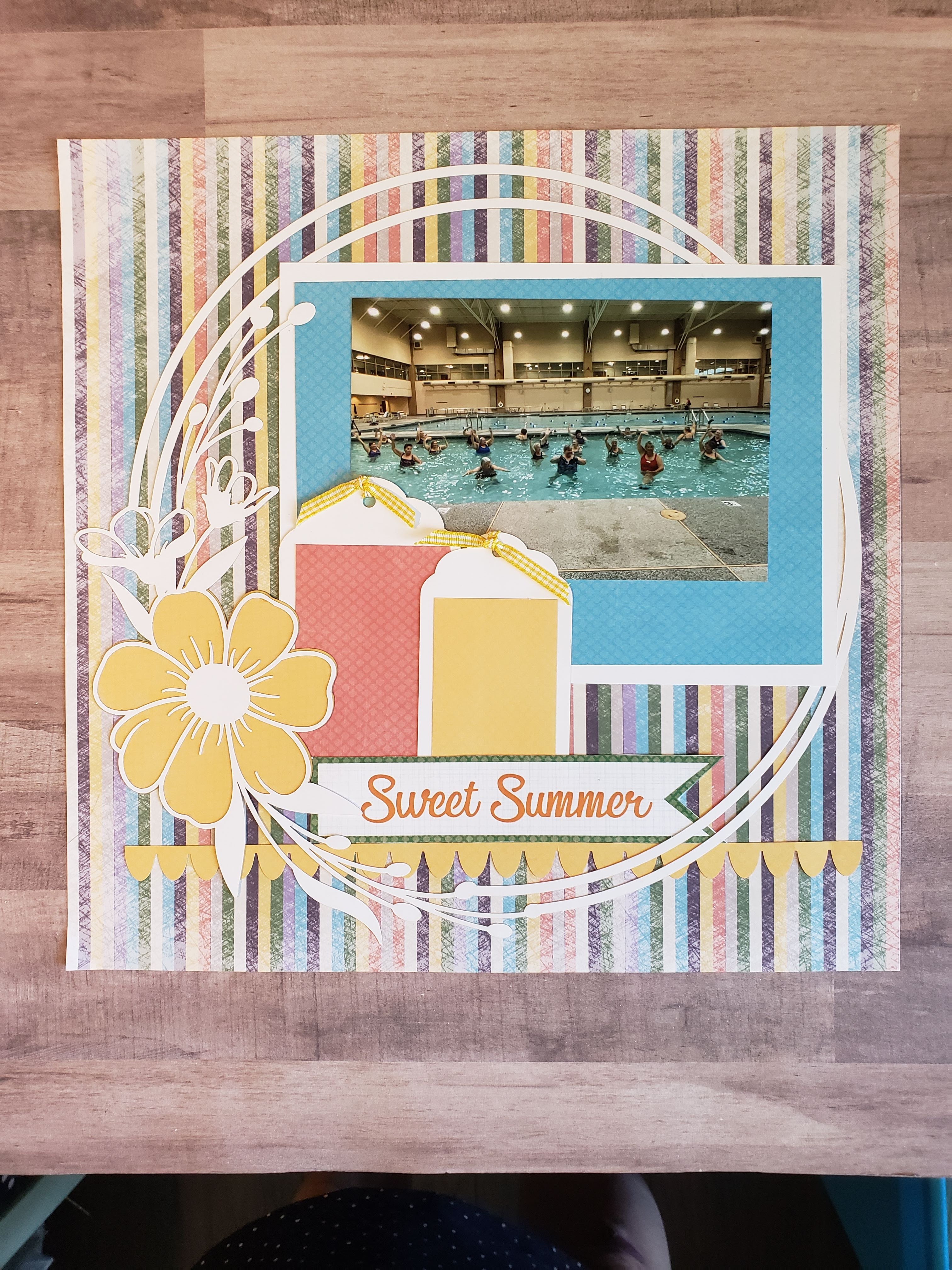 Welcome to my Aqua Fitness class! As I mentioned in an earlier blog, I went on a scrapbooking retreat at the first of the month. I have gobs and gobs of base pages I have made in classes at the Creating Keepsakes Conventions I’ve attended over the past years. Now the rush is on to actually put photos on pages. Before I head off to the retreat, I pull out all of my base pages (300 plus) and photos of whatever year I am working on. This time I decided I needed to scrap 2022. I lay out my scrap base pages in groups and then start trying to match photos up to pages and take the whole mess with me to the retreat. Once there, I earnestly try to place the chosen photos on my pages, flipping things from horizontal to vertical or vice versa (UnDu is a lifesaver), trimming photos to match photo mats, adding additional bling or the dozens of other things I try to make everything work out. The above scrap page was one of the easiest. All I had was one photo, and the empty tags will be printed with dates and some brief journaling documenting the photo. Speaking of journaling, every Thursday at the end of the fitness class, the music we exercise to reminded me of the little dancing ballerina that was in the old music boxes. I encouraged the ladies in the class to channel their “inner ballerinas” and we all have a blast every Thursday doing just that!
