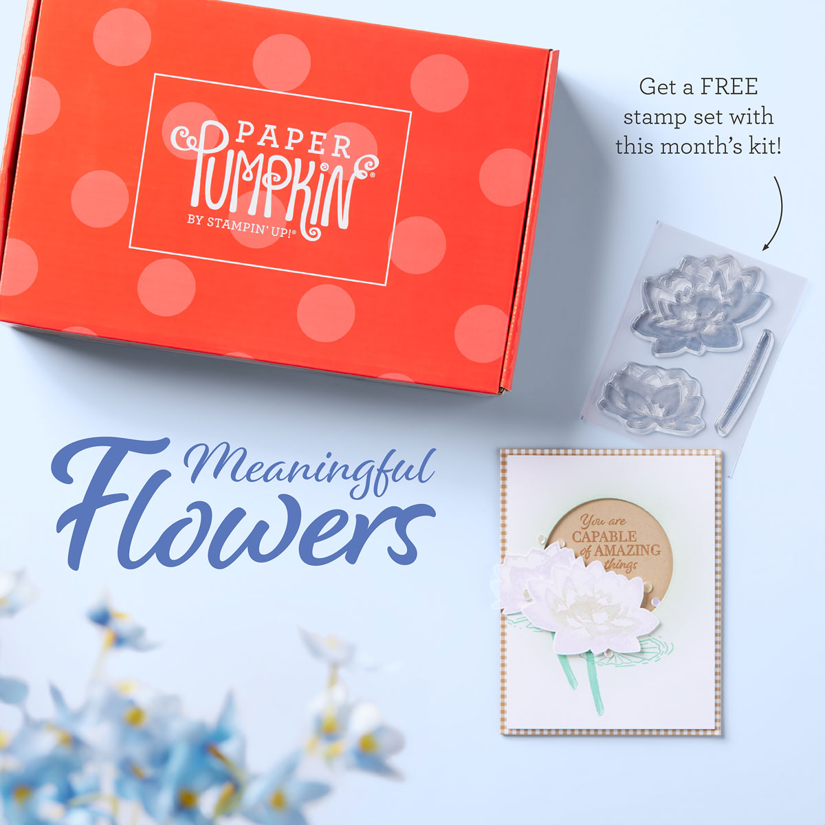 Not only does the August Paper Pumpkin Kit convey a beautiful message, but it also has beautiful watercolor designs! Each forget-me-not and lotus flower was hand painted just for you. Getting a lovely paper craft that carries real meaning has never been easier!