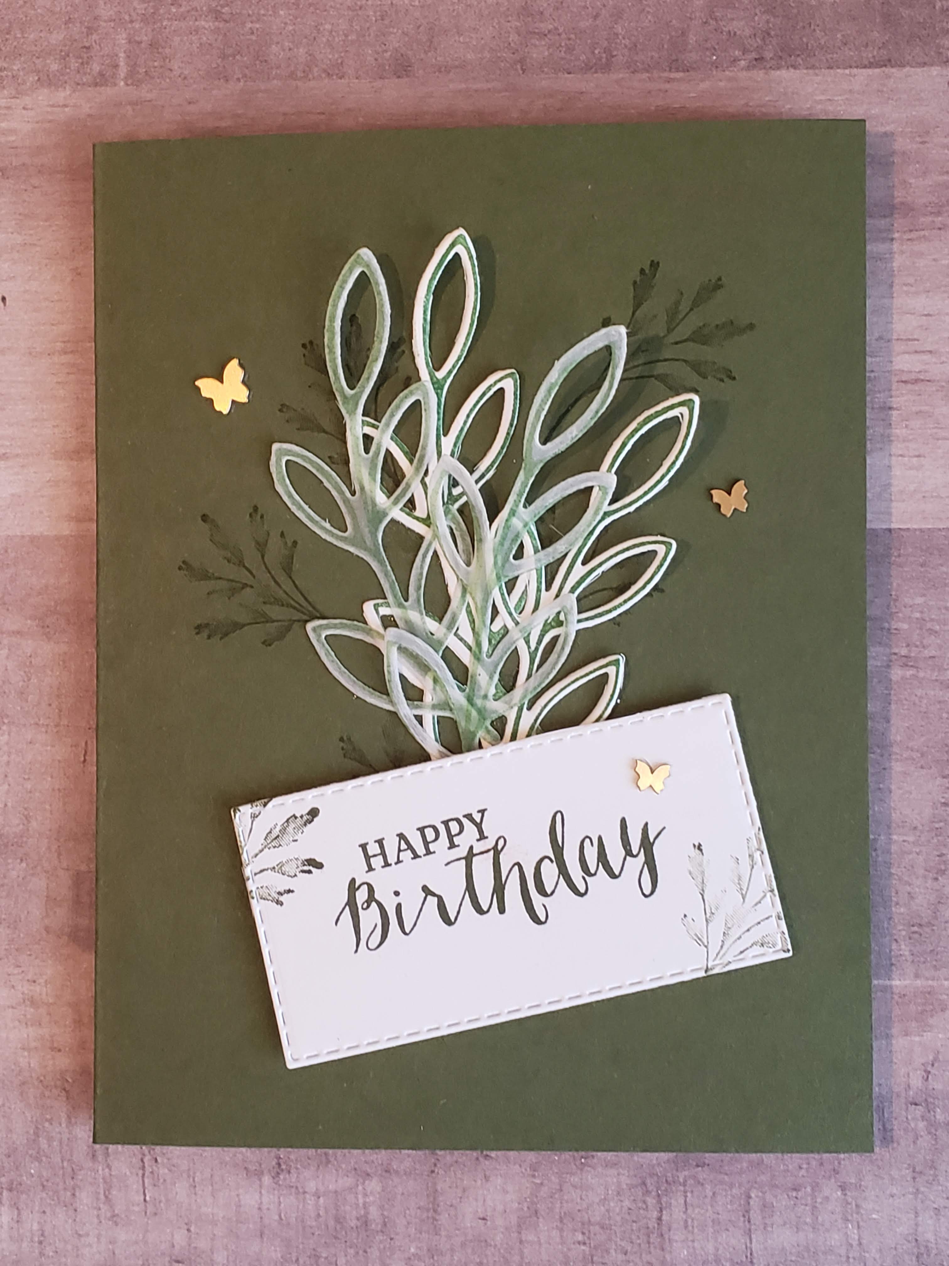 I used Mossy Meadow cardstock as my card base and stamped one of the leaf images from the retired Eden’s Garden stamp set in Mossy Meadow on the actual card base. I attached the die cut leaves to the card and then using the Stitched Rectangle die, cut it out and stamped Happy Birthday and a few more leaves on it for my sentiment and added it to the card with dimensionals. For an additional touch, I added a few of the Brass Butterflies. Simple but fun.