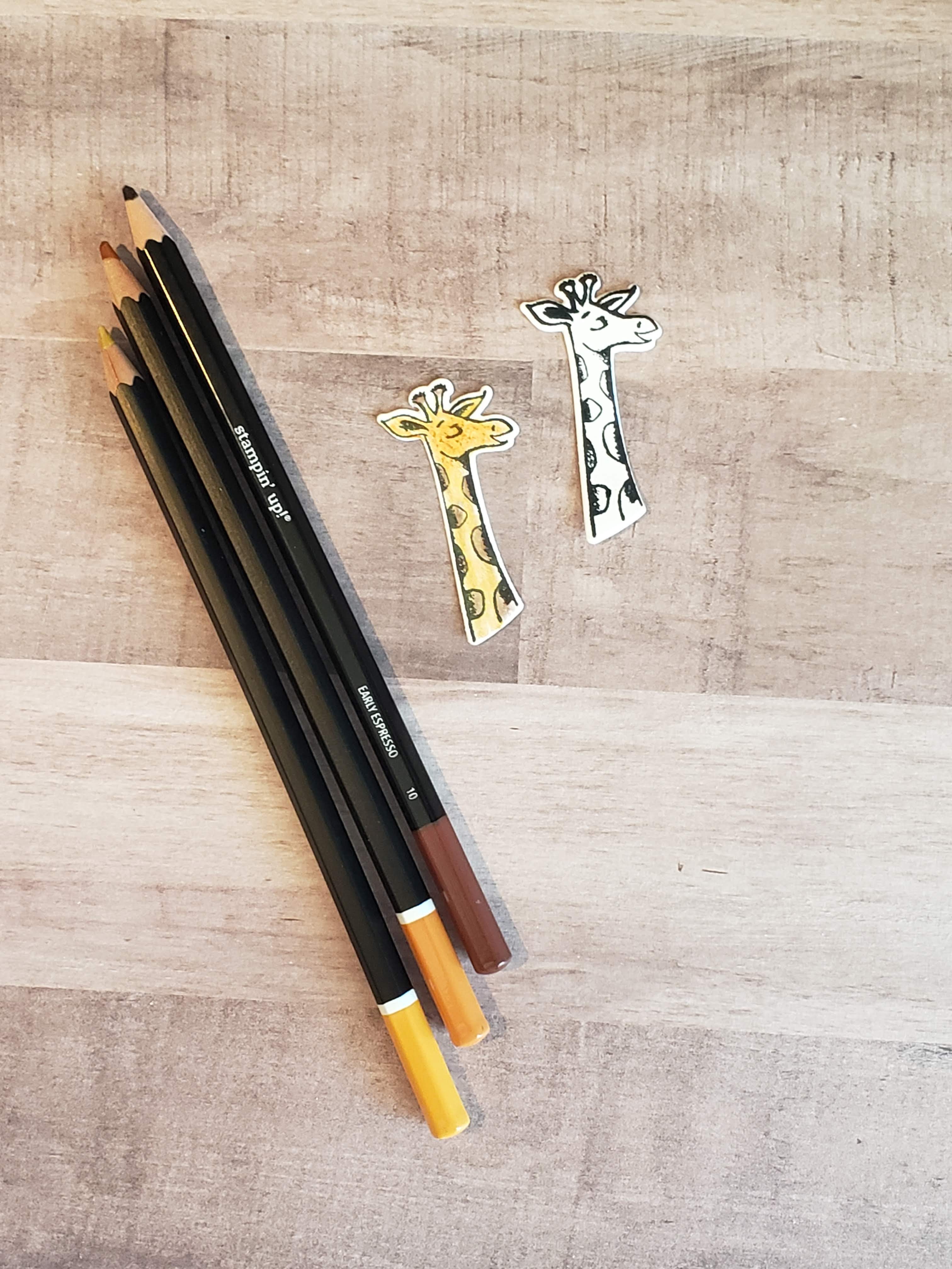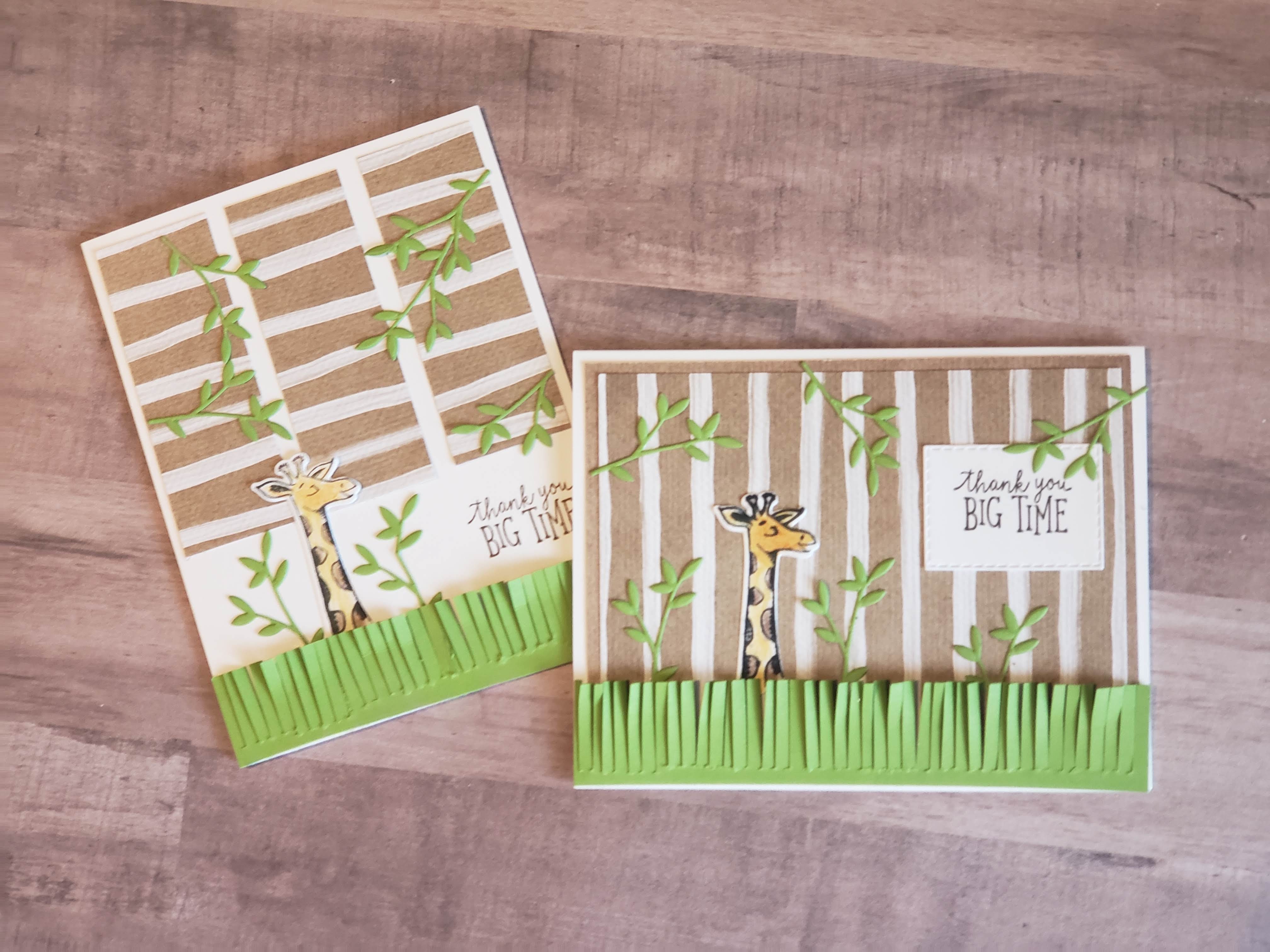 Next I stamped my giraffe and die cut it out. I colored it in using my watercolor pencils but just used them as colored pencils. I then added more die-cuts of leaves and got the finished product, along with using the Stitched Rectangles to cut out my thank you. I’ll be working on more blank card bases in the coming weeks.