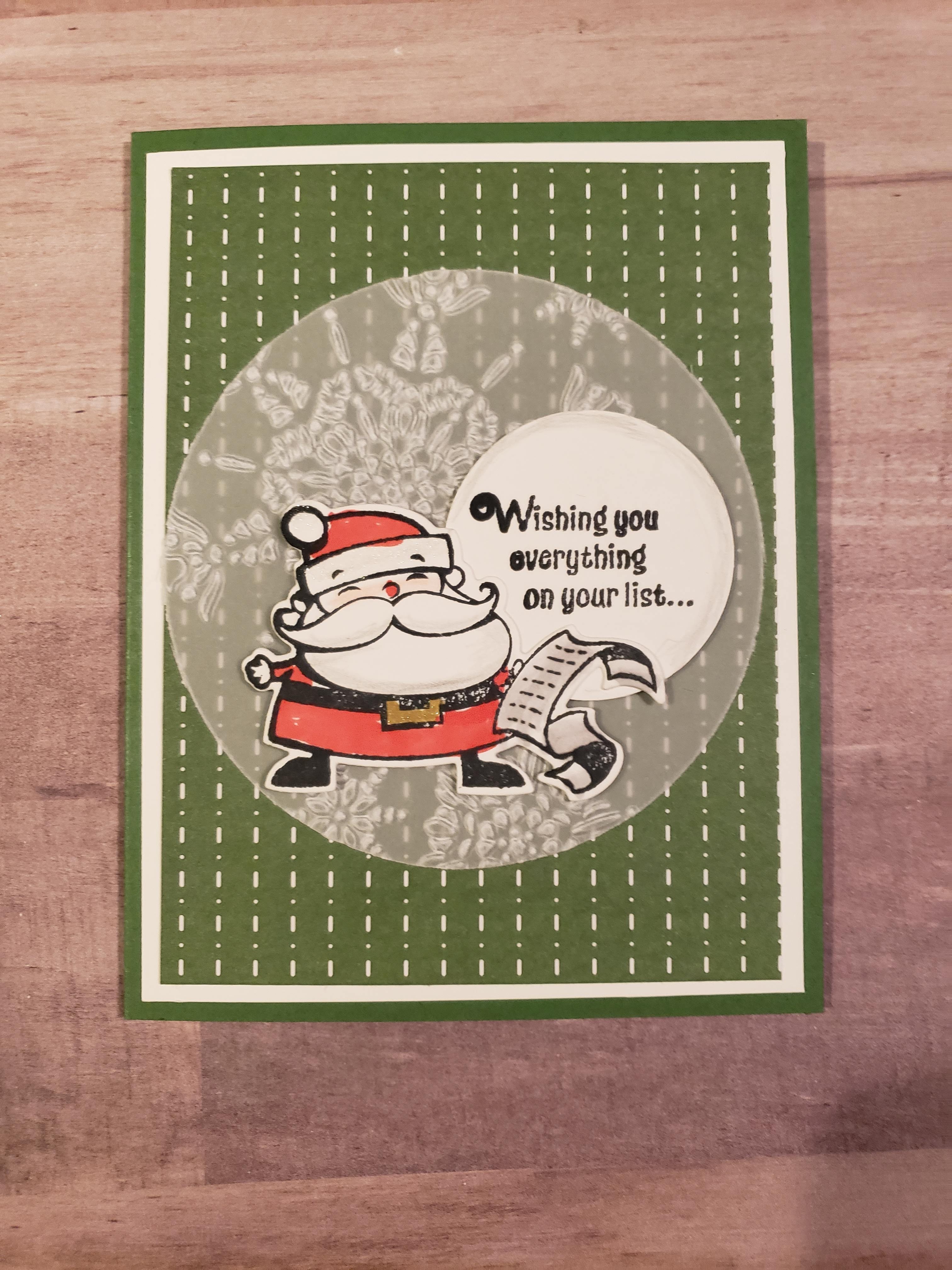 Above is the card we made using the Signs of Santa retired Stampin’ Up! stamp set. Simple layering of cardstock on the card and I embossed the vellum circle with the Northern Flurry embossing folder. Of course, Santa was fun to color in. I added some Wink of Stella on Santa and I think that is one of the reasons his photo turned out poorly.