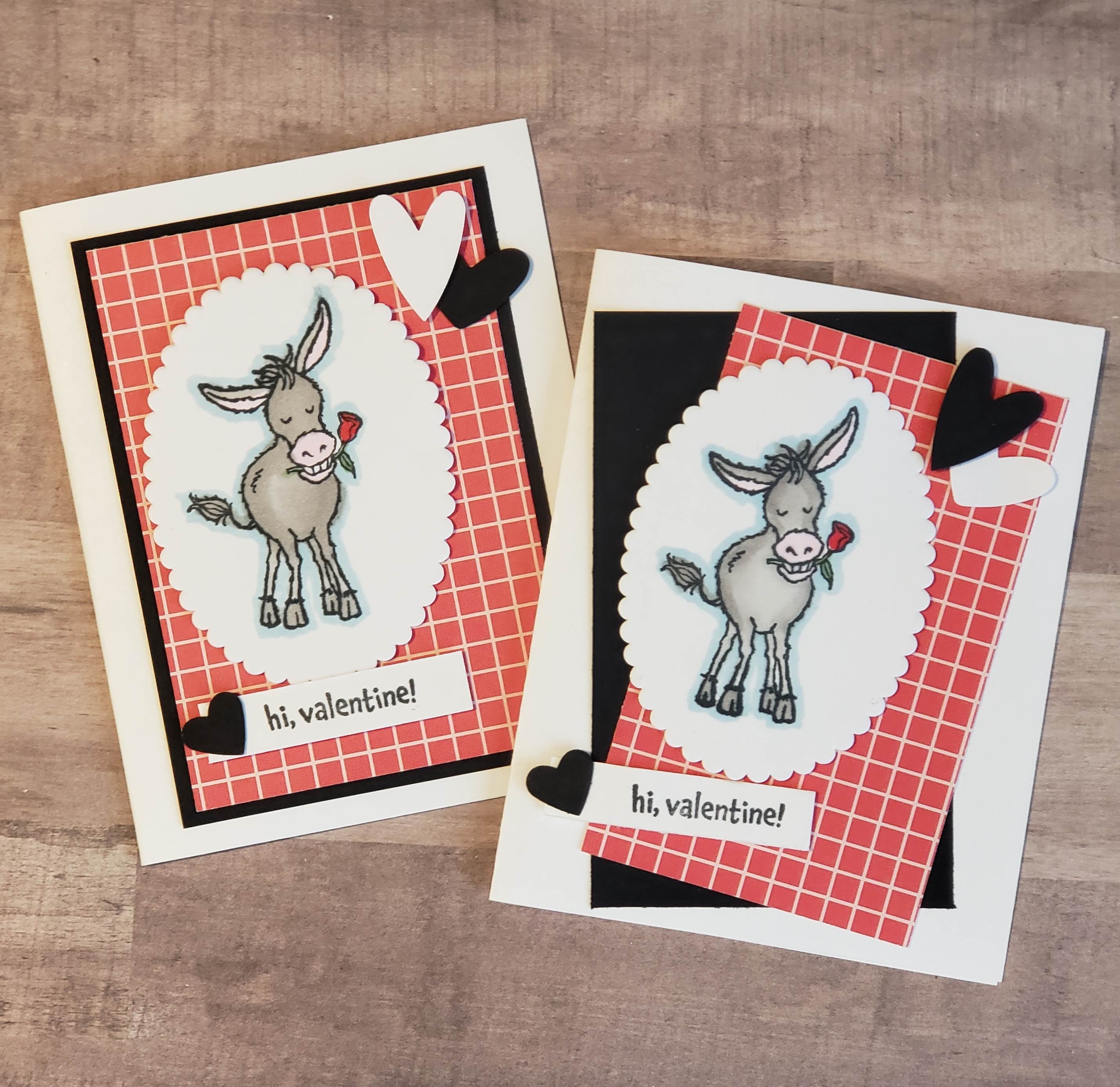 Anyway, I saw a card on Pinterest and based this Valentine card on it. Of course, can’t find it again to give the original creator credit. I made around 25 of these for our Craft Club to distribute to local nursing homes for the residents’ use. I had a blast coloring in the donkey!
