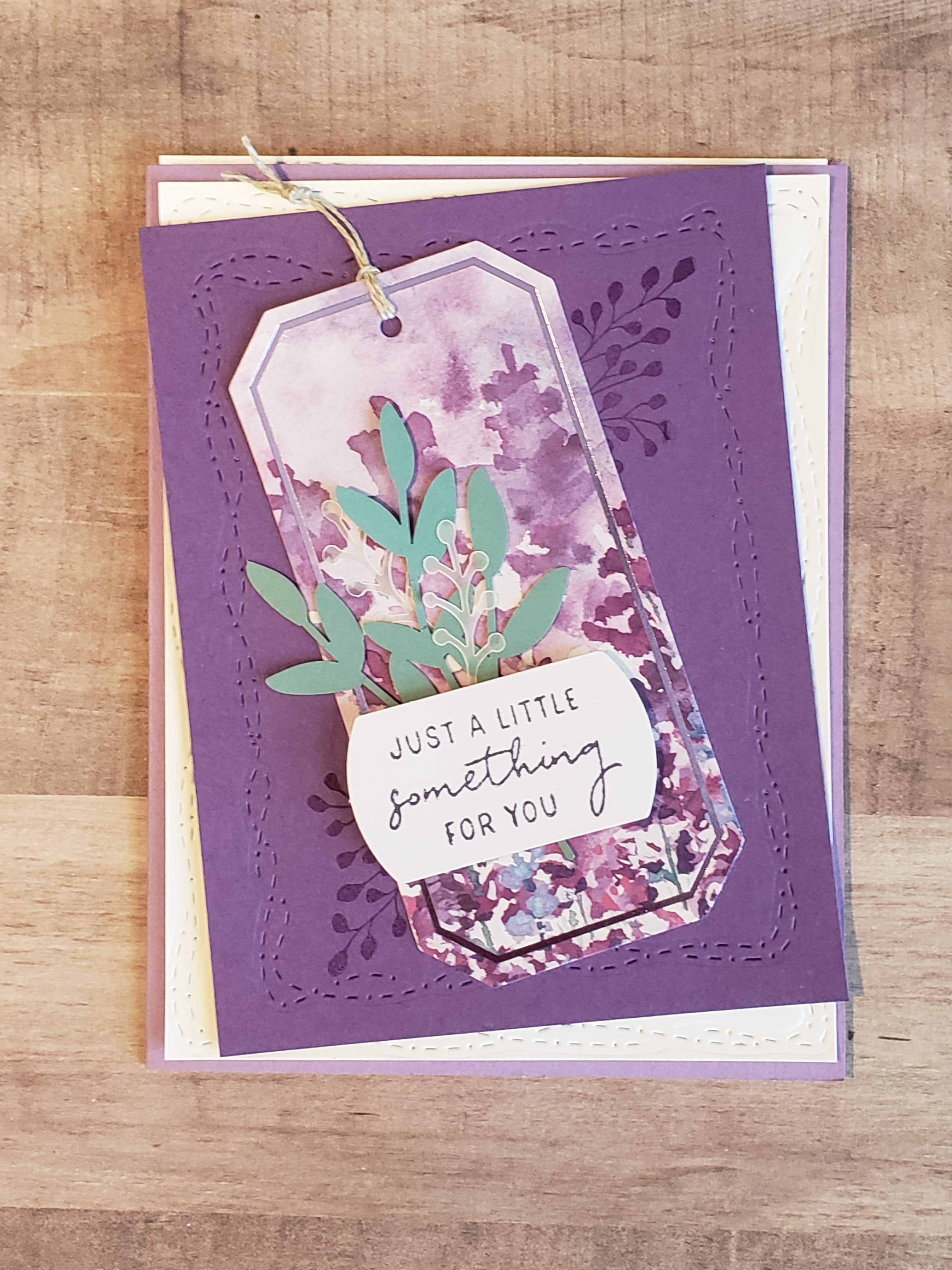 I started with a Highland Heather card base. I added a piece of Basic White cardstock (measuring 4 x 5-1/4) and a piece of Gorgeous Grape cardstock (measuring 3-3/4 x 5). I took the Stitched with Whimsy retired die and created the stitched look along both pieces of cardstock. I stamped the lavender image in Gorgeous Grape to add a little bit of variation to the card. The easy part was simply adding the tag to the card with dimensionals.