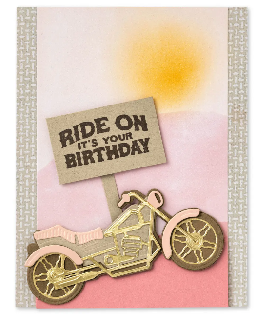 Believe it or not, this was the card I got my idea from. I know it doesn’t look anything like my card, but I took the way the card had a border edge and the motorcycle is slanted and kind of set on a base of some sort and I just went from there. When you click on the Legendary Ride stamp set when shopping on my website, there are a number of samples using the set.