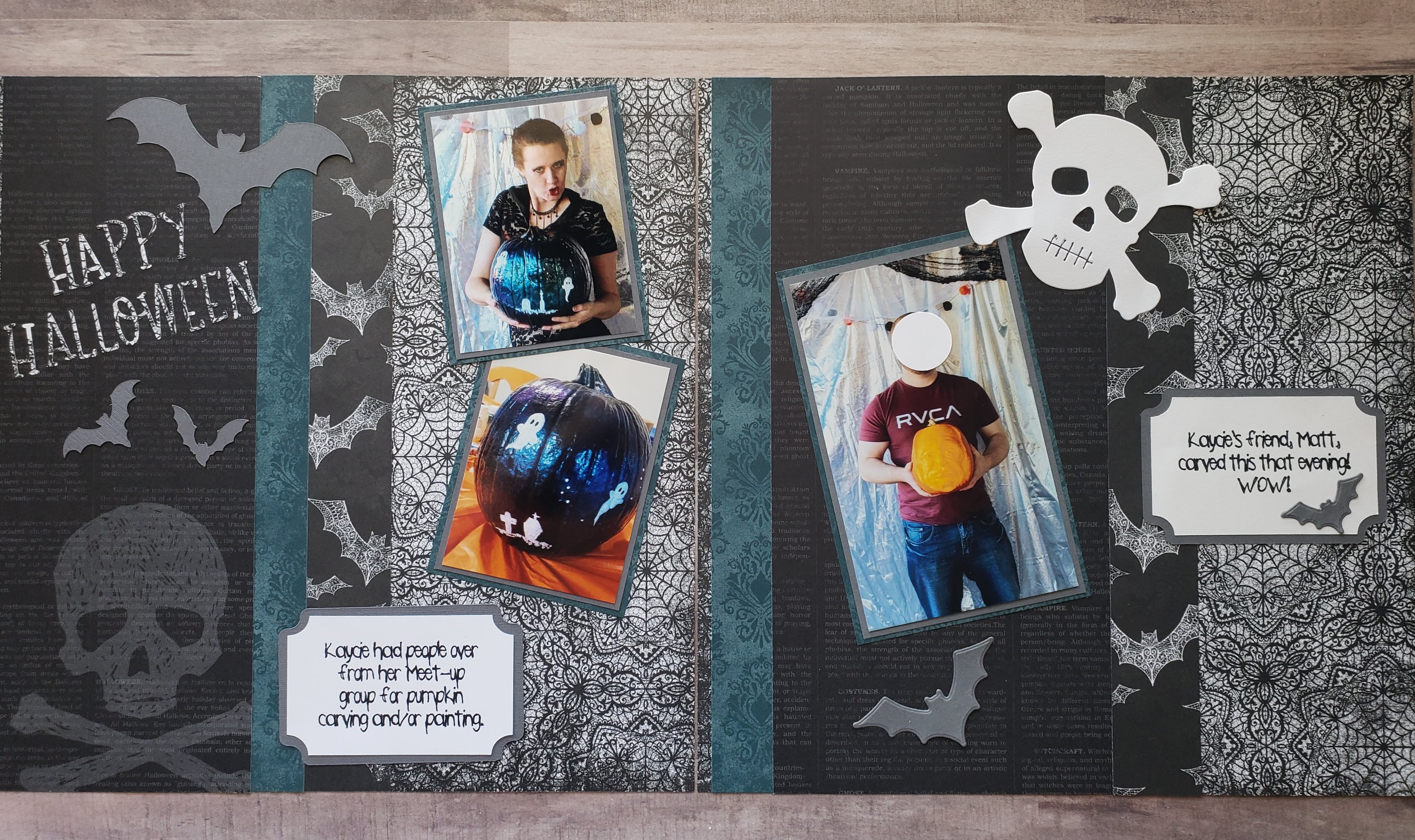 I kind of clipped off the edge of the page on the left when taking my photo of the pages. I used the Hallows Night Magic stamp set and coordinating framelits, along with a few images I cut with my Cricut.