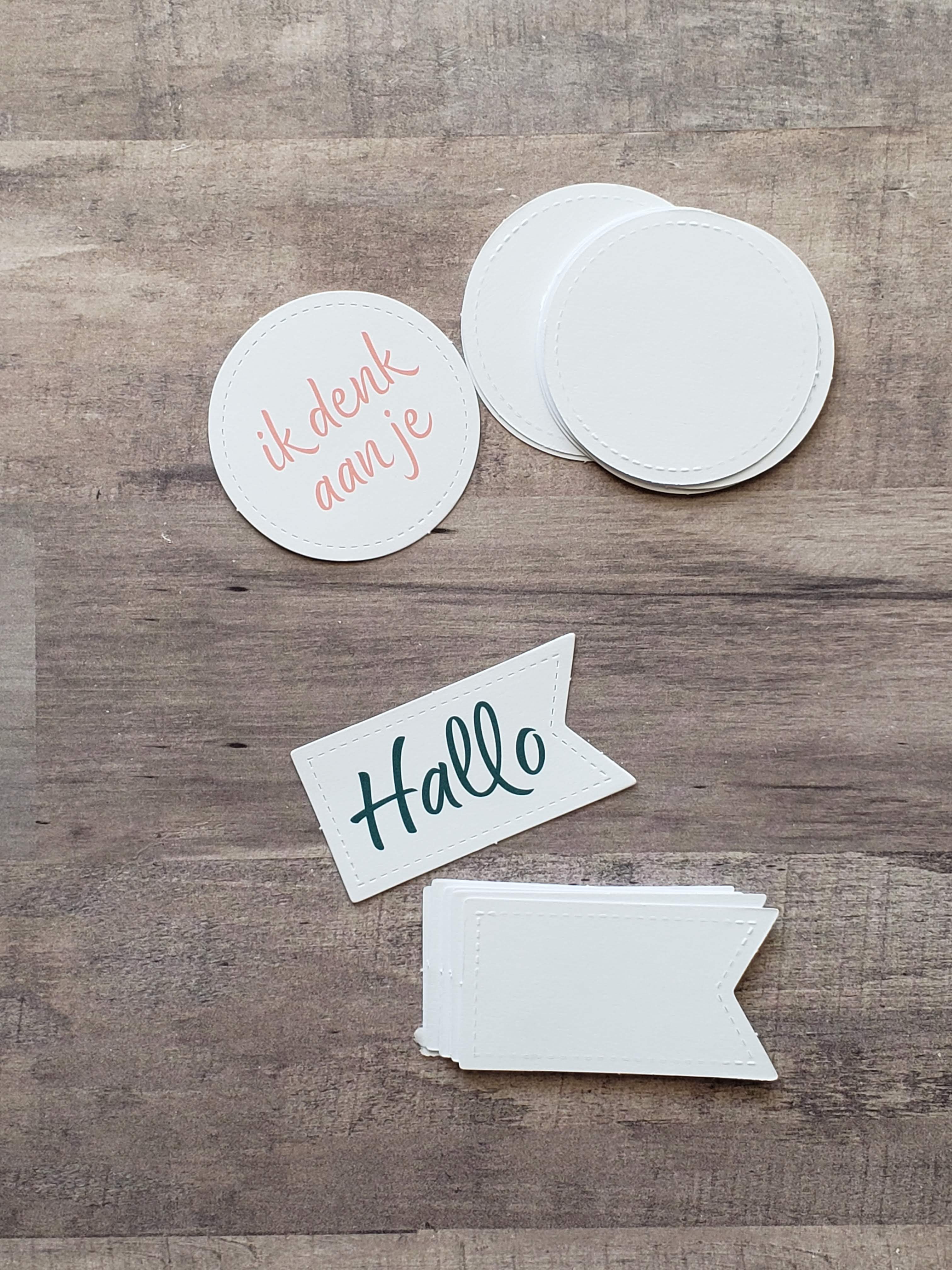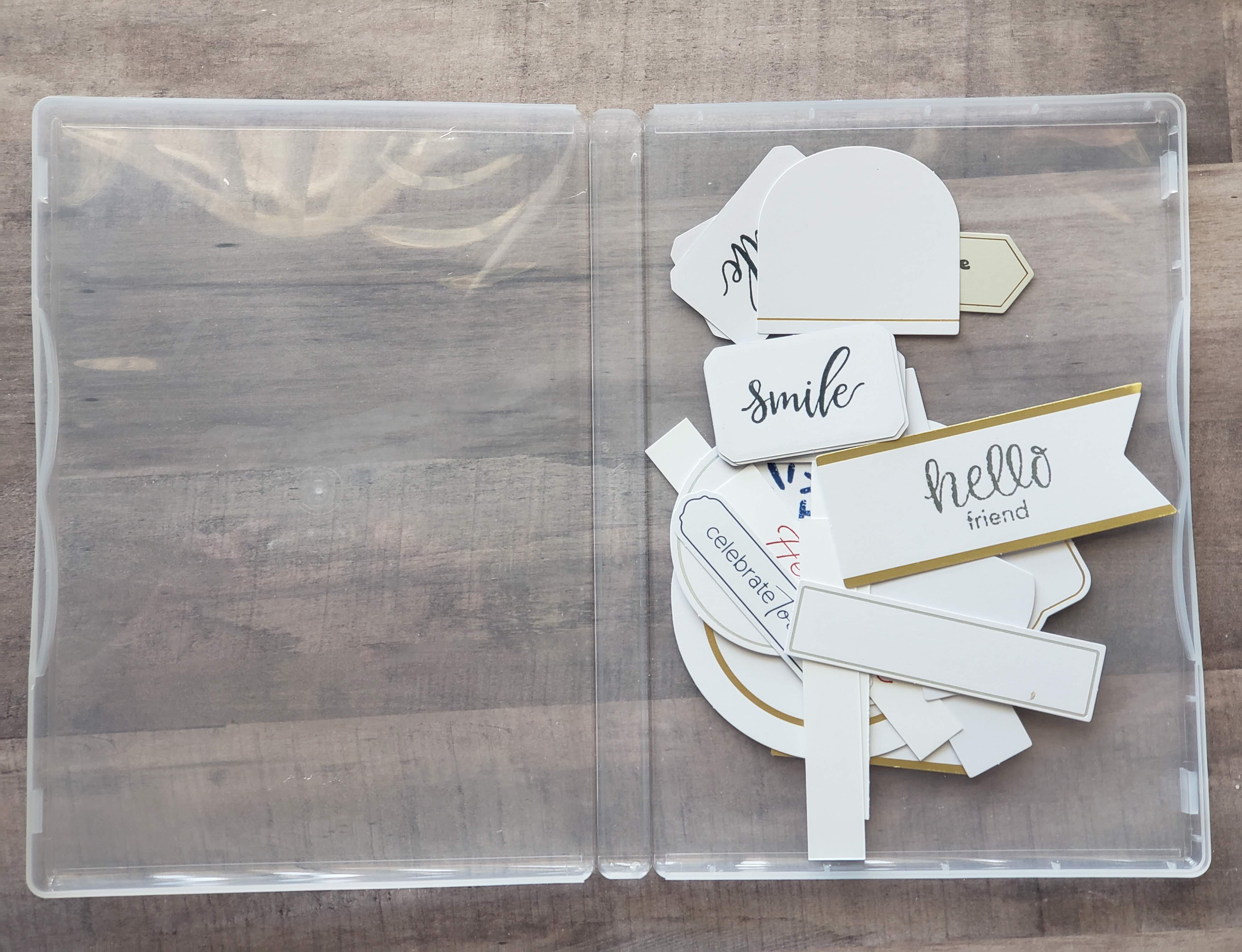 This kit has sayings in several different languages. I keep the cutout pieces from these kits that have extra tags, circles, etc., in the different languages. Even though I won’t use the stamped sentiment, the other side is great for doing my own stamping.